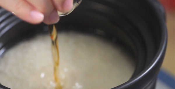 水に30分浸漬させた米を土鍋に入れ、昆布だし汁、みりん、酒、塩を入れて、軽くかき混ぜる。