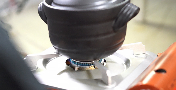中火で約15分炊き、蒸気が上がり始めたら弱火にしてさらに15分程度炊く。 ※上記時間はあくまで目安のため、火力や土鍋により適宜調節する。