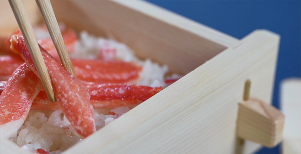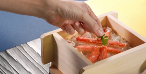 炊きあがったご飯をヒノキのせいろに入れ、ご飯の上に殻を取ったカニ肉をのせる。
