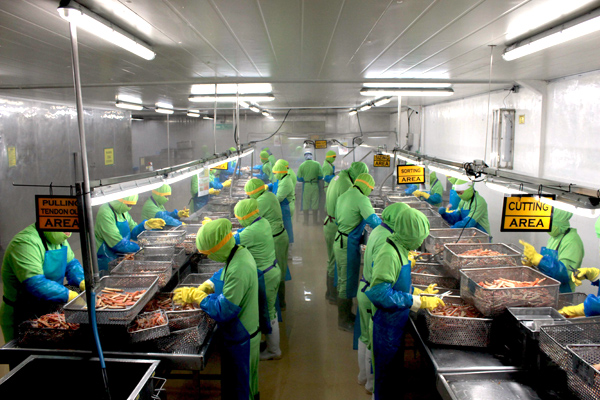 インドネシアの工場では、カニを各パーツに分け、用途ごとに使いやすい形状(むき身、かに爪、フレークなど)に加工しています。