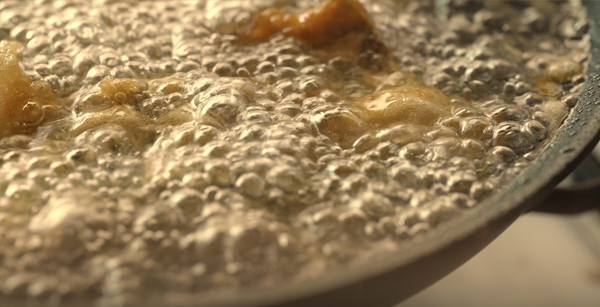 180℃に熱した油で、約2分間揚げる。チップスに少し火が通ったら、油から取り出し、油を切る。片側に寄せておく。