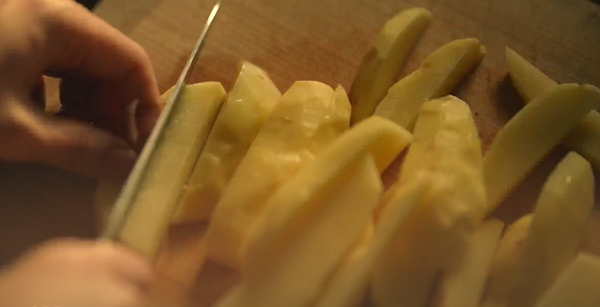 ジャガイモを厚さ1.2㎝程度に切り、これを1.2cm幅のチップスにスライスする。