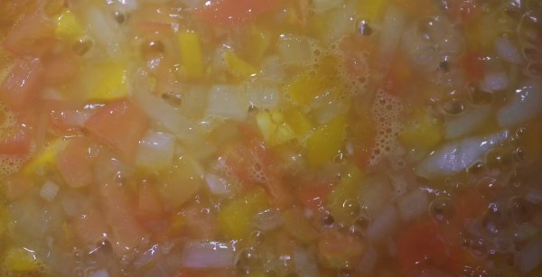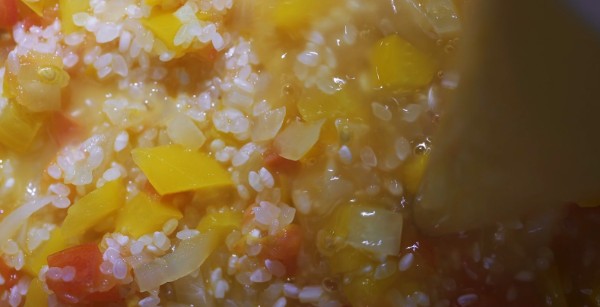 スープを煮始めたら、並行してリゾットの準備をする。フライパンにオリーブオイルを入れ、みじん切りした玉ねぎとにんにくを炒め、黄金色になったらパプリカとトマトを加え数分間炒める。白ワインを入れ、アルコールがとぶまで煮る。