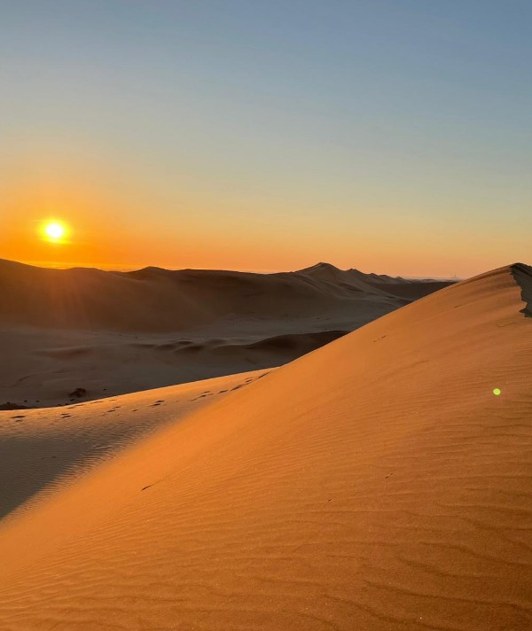 大洋ナミビア社の基地があるワルビスベイ港から車で20分移動すると広大なナミブ砂漠が広がっています。ラクダに乗りまったり砂漠を楽しむもよし、バギーで爽快に駆け巡るもよし、特に砂丘の頂上からの夕焼けは絶景です。